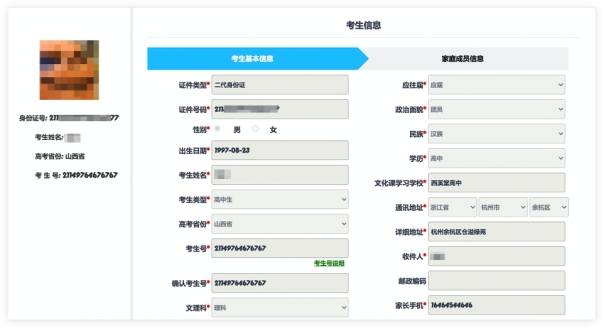 登录后,考生填写基本信息,填写完毕后保存信息。考生需要先选择自己参加高考的所在省(市、区),然后输入自己的考生号,点击下一步后,填写自己的详细信息,填写完成后,可以生成预览效果,确认无误后,点击确认提交。(确认提交后不能再次修改)