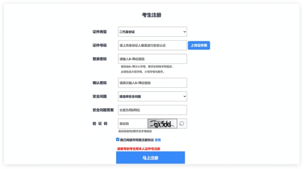 考生注册需要输入身份证号码、系统密码和安全问题,安全问题答案在考生忘记密码的时候可以用来重新设置密码,确认无误后点击注册,注册完成后,可以用身份证号码和密码登录到艺术升报名系统的主界面。